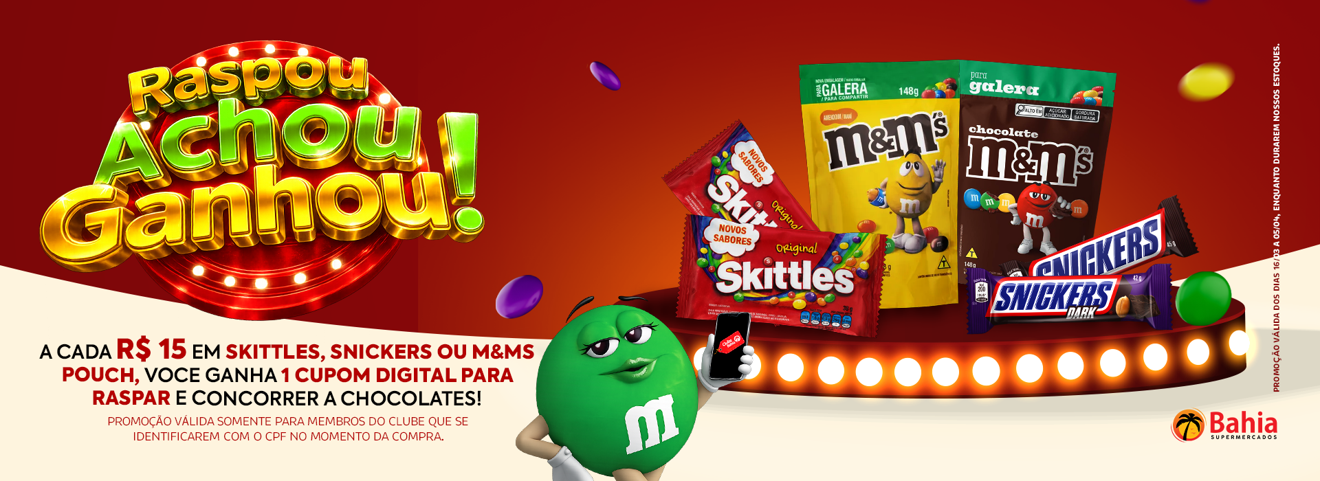 A cada R$ 15 em Skittles, Snickers ou M&M’s Pouch, de 16/03 a 05/04, você ganha 1 cupom digital para raspar e concorrer a deliciosos chocolates.